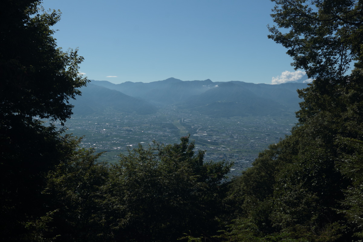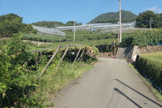 ブドウ畑や桃畑の斜面を登って行きます。 すれ違う人たちがみんな「おはようございます」と声をかけてきます。私も「おはようございます」と返します。 防犯目的なのだろうとは思いますが、気持ちが良いです。