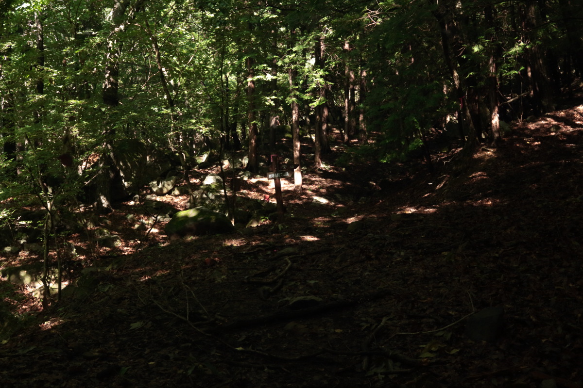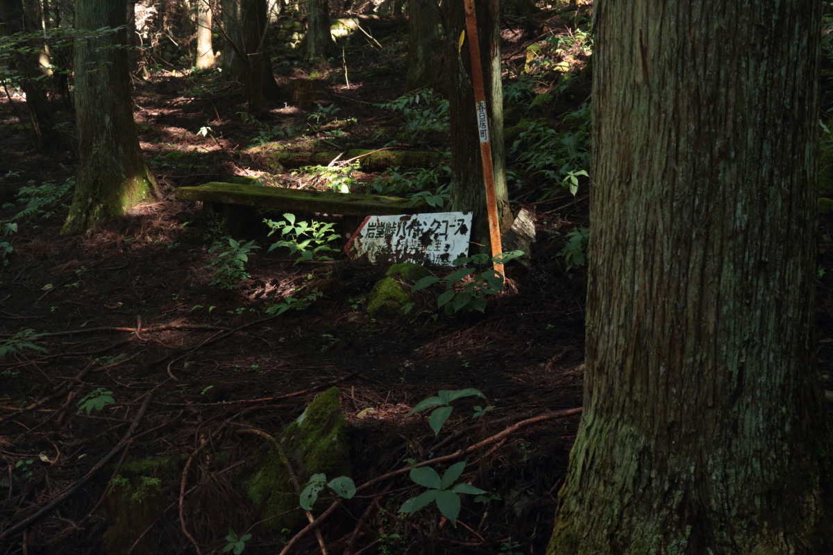 ここから上り返しになるのですが、登山道が川状になっているので、深みにはまらないよう注意して歩きました。 近くには年代を感じるような道標跡がありました。