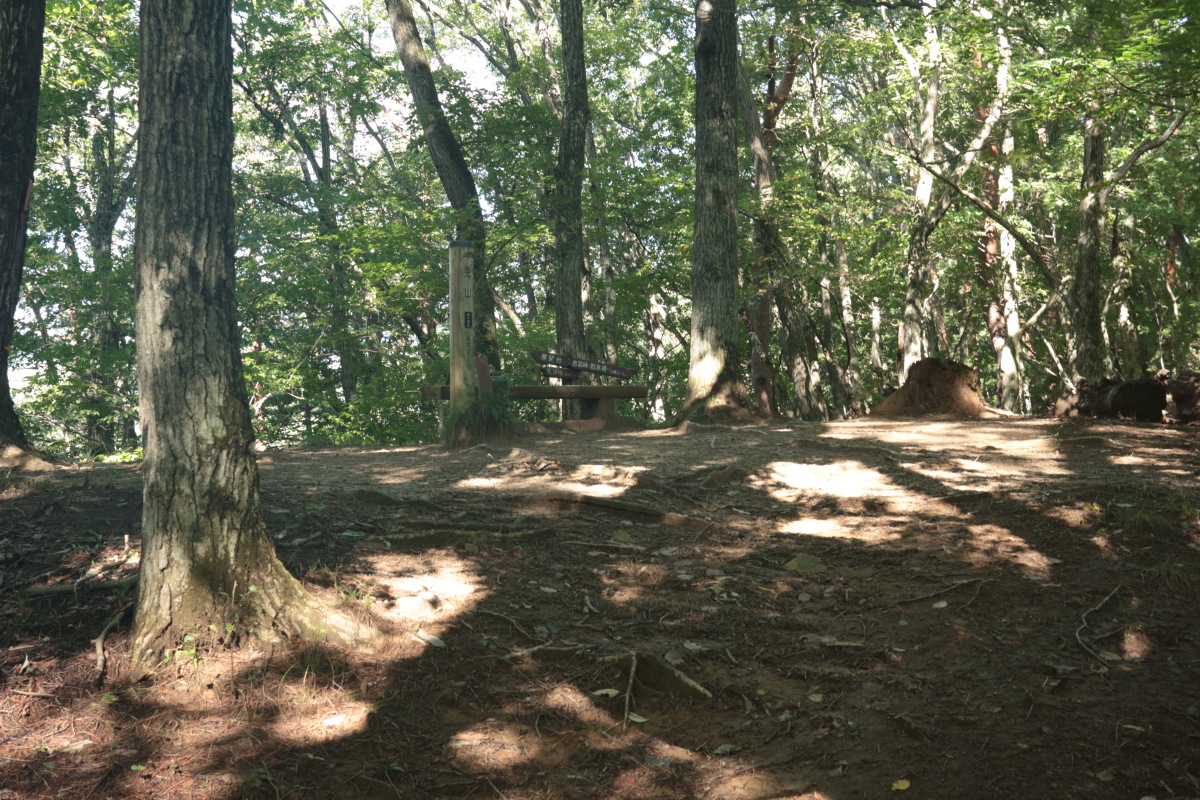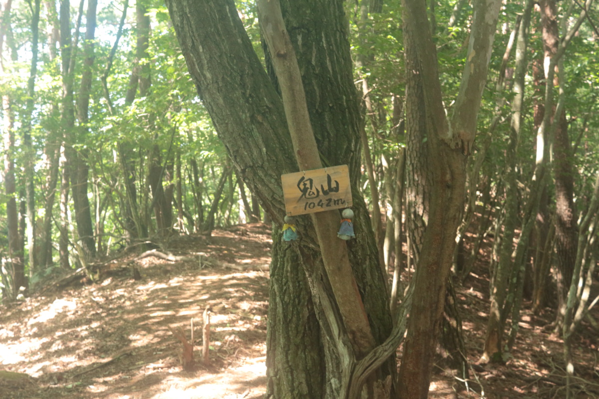 10分ほどで、鬼山(1,042m)到着(10:06)。本日の最高峰です。 山頂名はこちら。眺望はありません。 このあたりでは最も標高が高い地点なのですが、目立たない山です。
