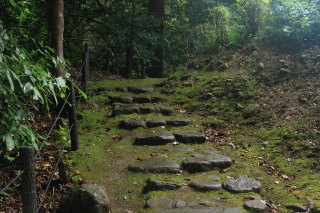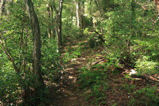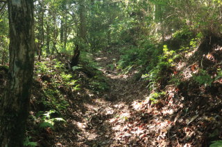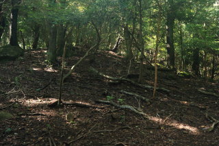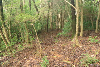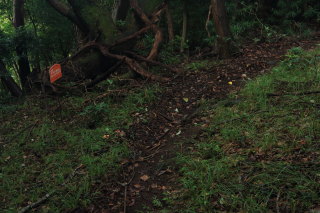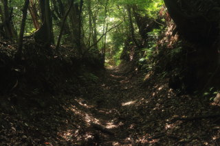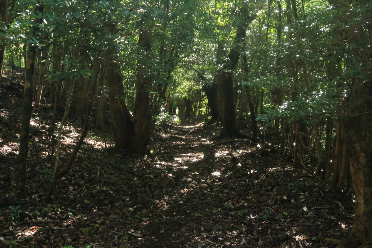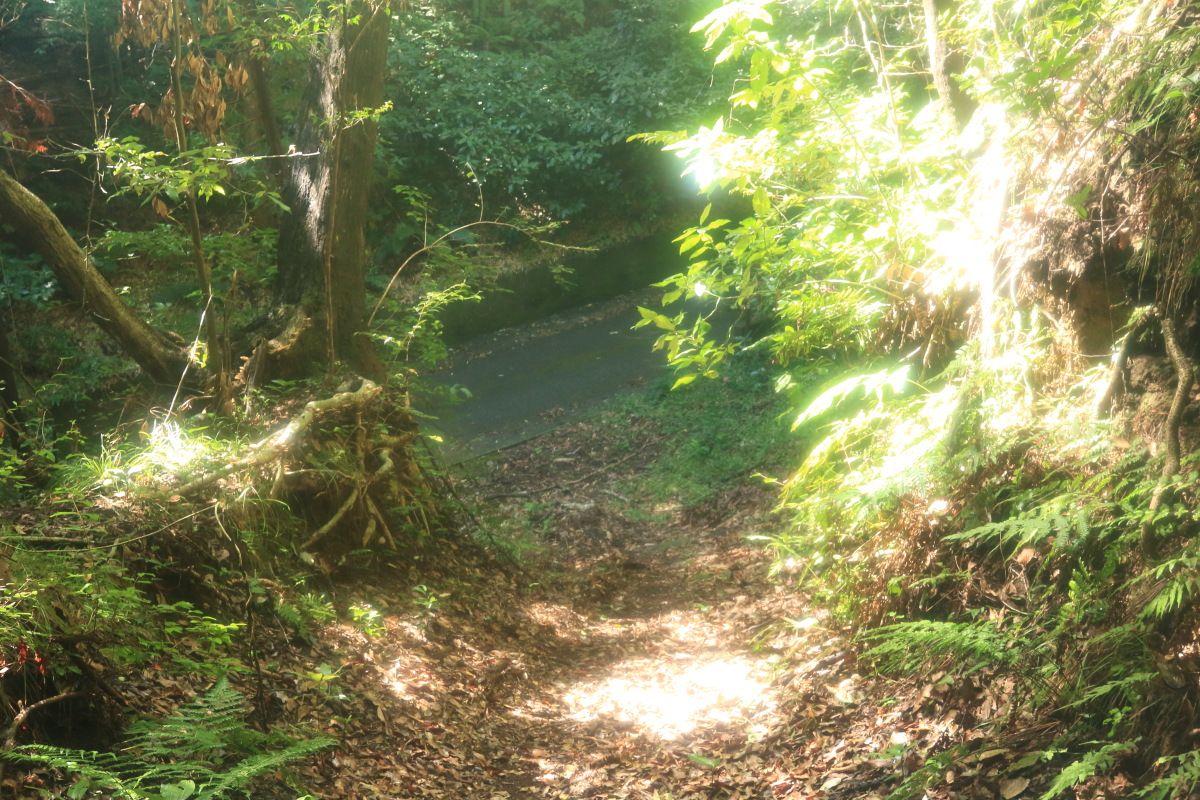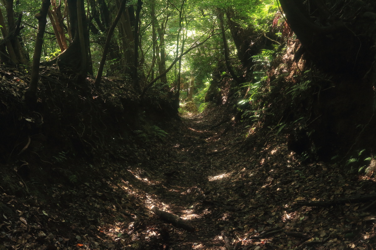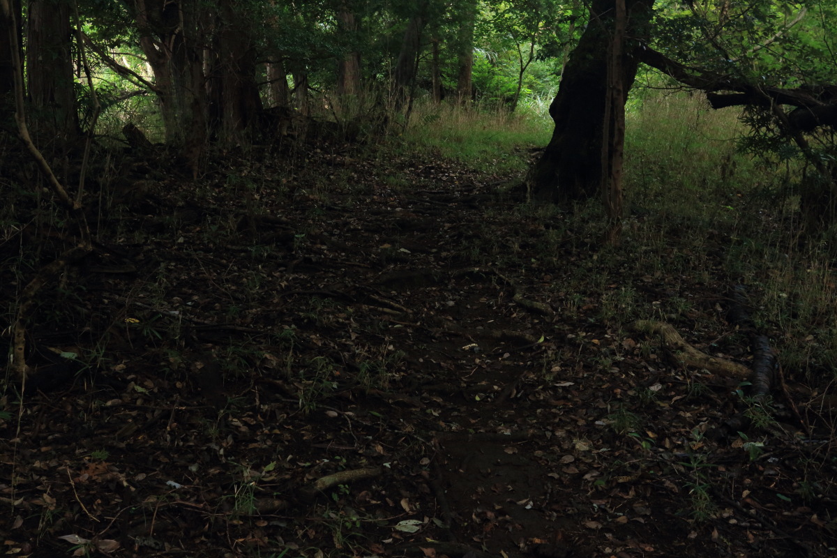 暗めの道になりますが、急坂は衰えません。 この切通しの終了地点から車道を外れて進みます。 Canon EOS Kiss X7 EF-S24mm f/2.8 STM 24mm(38mm) ISO 1600 F5.6 1/80s |