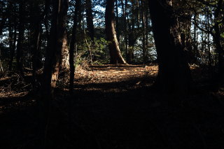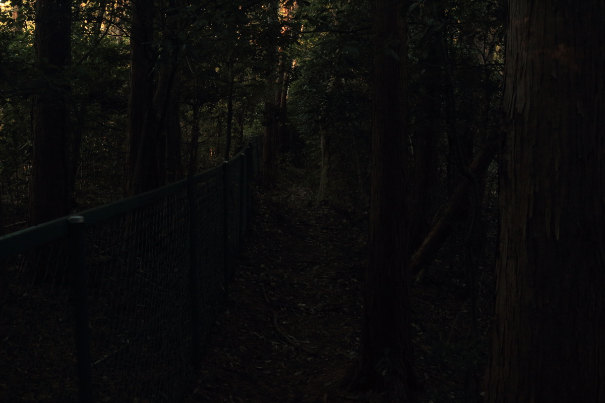 林の中はまだ真っ暗。左(南)にはずっと金網が続いていました。 Canon EOS Kiss X7 EF-S24mm f/2.8 STM 24mm(38mm) ISO 1600 F5.6 1/60s |