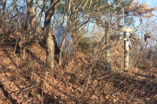 機神山(118m)は古墳なので立ち入り禁止(9:24)。 20分ぐらい前に見えていた白い鉄筋コンクリートの隣です。 Canon EOS Kiss X7 EF-S24mm f/2.8 STM 24mm(38mm) ISO 100 F10.0 1/400s |