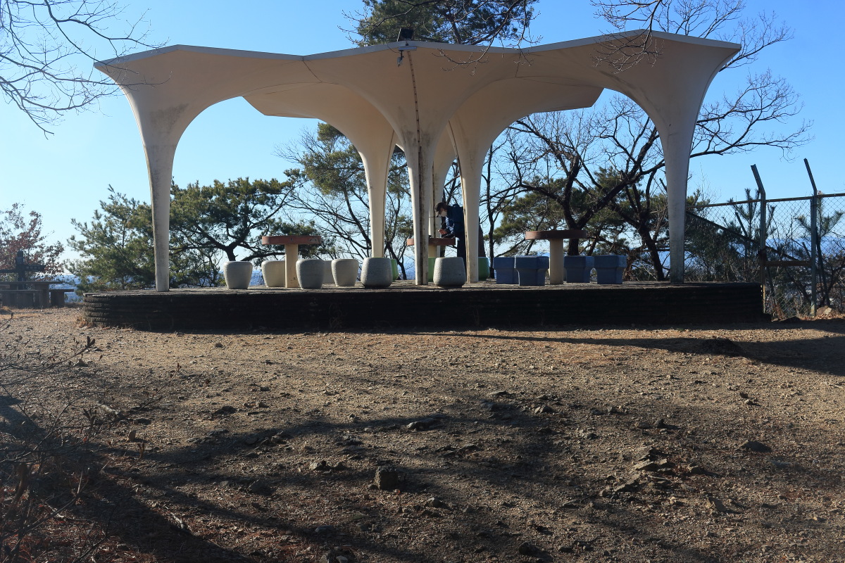 鏡山(160m)通過(9:17)。 昭和時代を思わせるデザインの休憩所です。 Canon EOS Kiss X7 EF-S24mm f/2.8 STM 24mm(38mm) ISO 100 F8.0 1/250s |