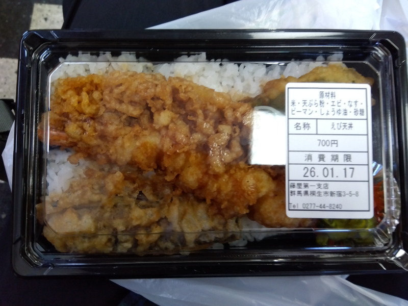 駅の売店で、えび天丼(700円)を買いました。甘かったですがおいしかったです。 SH-M20 3.6mm(26mm) ISO 194 F2.0 1/30s |