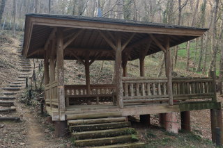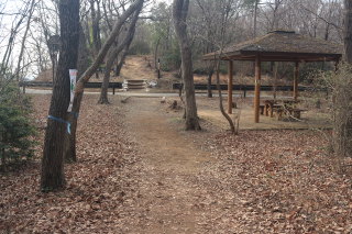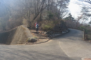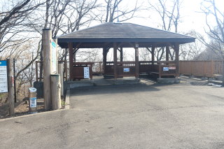 下り切って進むと車道や東屋がありました。